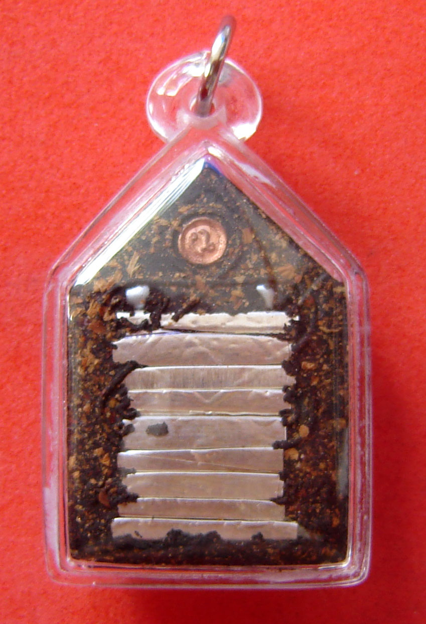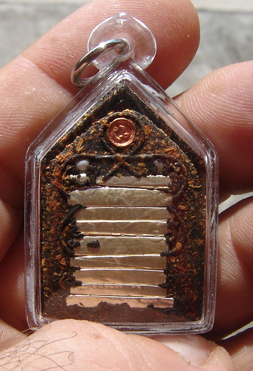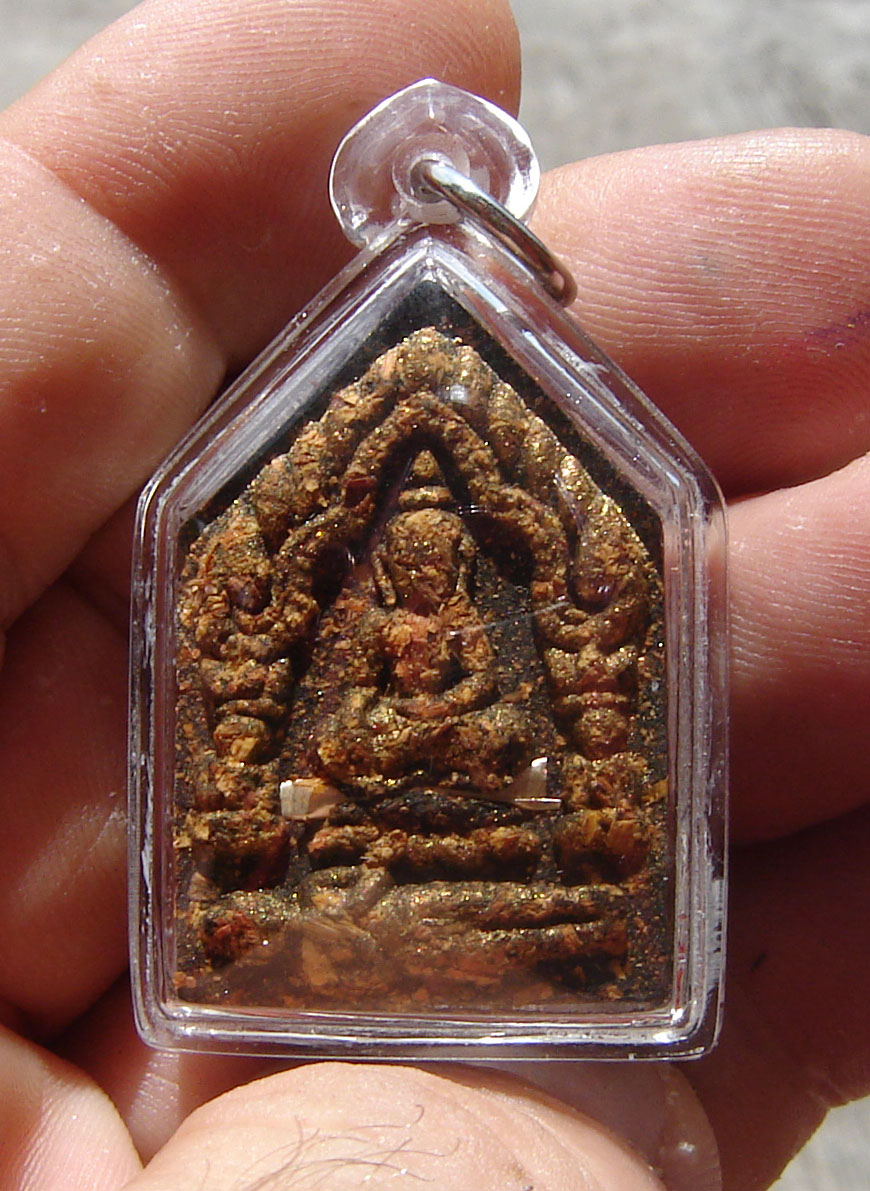 These powders should be made into a Buddha amulet and given three months of empowerment. Tests should be made on the amulets for their power, and also those who recieved them and wear them must make an official oath to the Buddha Dhamma and Sangha to leave sinful and immoral activity forever, and to practice Metta and offerings to the Sangha. If those who wear the amulet can keep these rules, they will be cmpletely safe and protected from the predicted evils. Luang Por Kong stayed in Wat Kae (wat Tan) in Supannburi during the time that Ayuttaya was the Royal Seat, and was the first Ajarn of Khun Phaen himself. He created the Pra Khun Phaen Ruean Gaew and gave to Khun Phaen himself for protection and blessings.